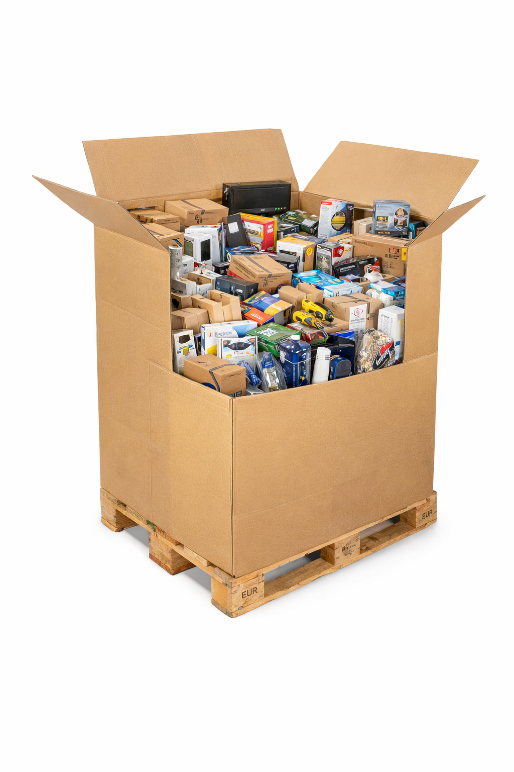 Elke pallet bevat een willekeurige mix van producten uit verschillende categorieën, waardoor iedere pallet uniek is.