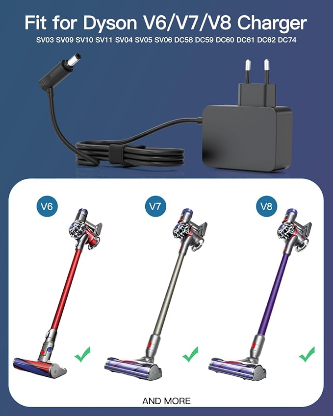 Deze hoogwaardige 26,1V oplader is perfect geschikt voor Dyson draadloze stofzuigers uit de V6, V7 en V8-serie, inclusief modellen zoals DC58, DC59, DC60, DC61, DC62, DC74 en SV03 t/m SV11. De voeding levert betrouwbare prestaties en een stabiele uitgang van 26,1V/0,78A (20W), waardoor je stofzuiger veilig en efficiënt wordt opgeladen.