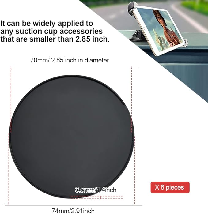 Met deze set van 8 zelfklevende dashboard schijfpads bevestig je eenvoudig je telefoonhouder of GPS op het dashboard van je auto. De schijven hebben een diameter van 74 mm en zijn gemaakt van stevig ABS-materiaal met hoogwaardig dubbelzijdig plakband. Hierdoor blijven je apparaten ook op hobbelige wegen stevig op hun plek.