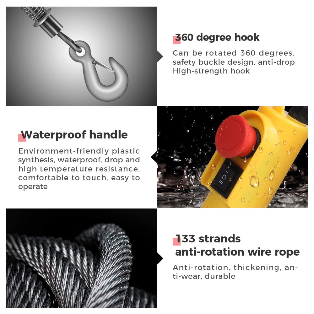 De lier is uitgerust met een noodstopschakelaar, automatische remfunctie en oververhittingsbeveiliging. Dit zorgt voor veilig werken, ook bij intensief gebruik. De staalkabel van 4 mm vermindert draaien van de last, waardoor je nauwkeuriger kunt tillen. De lange afstandsbediening maakt bedienen vanaf de grond eenvoudig en geeft je vrije handen zodra het werkmateriaal op zijn plek hangt.