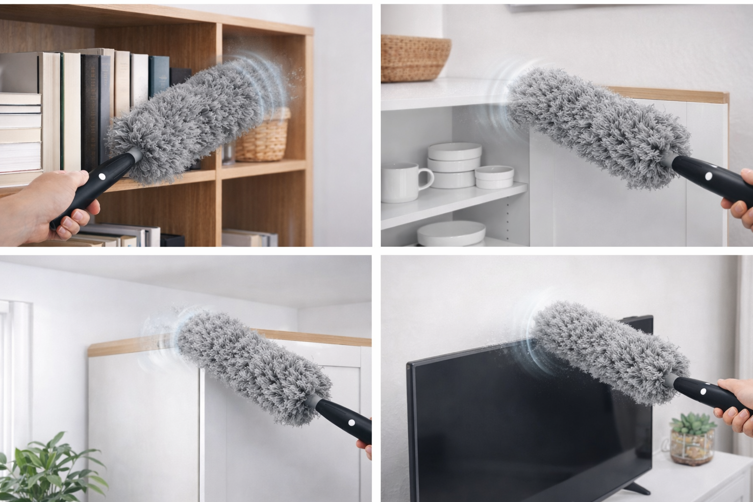 Deze elektrische plumeau is ideaal voor jaloezieën en blinds. De draaiende microvezelkop komt gemakkelijk tussen de lamellen en verwijdert stof zonder het te verspreiden. Ook perfect voor boekenplanken, kasten, meubels, decoraties en andere delicate oppervlakken.
