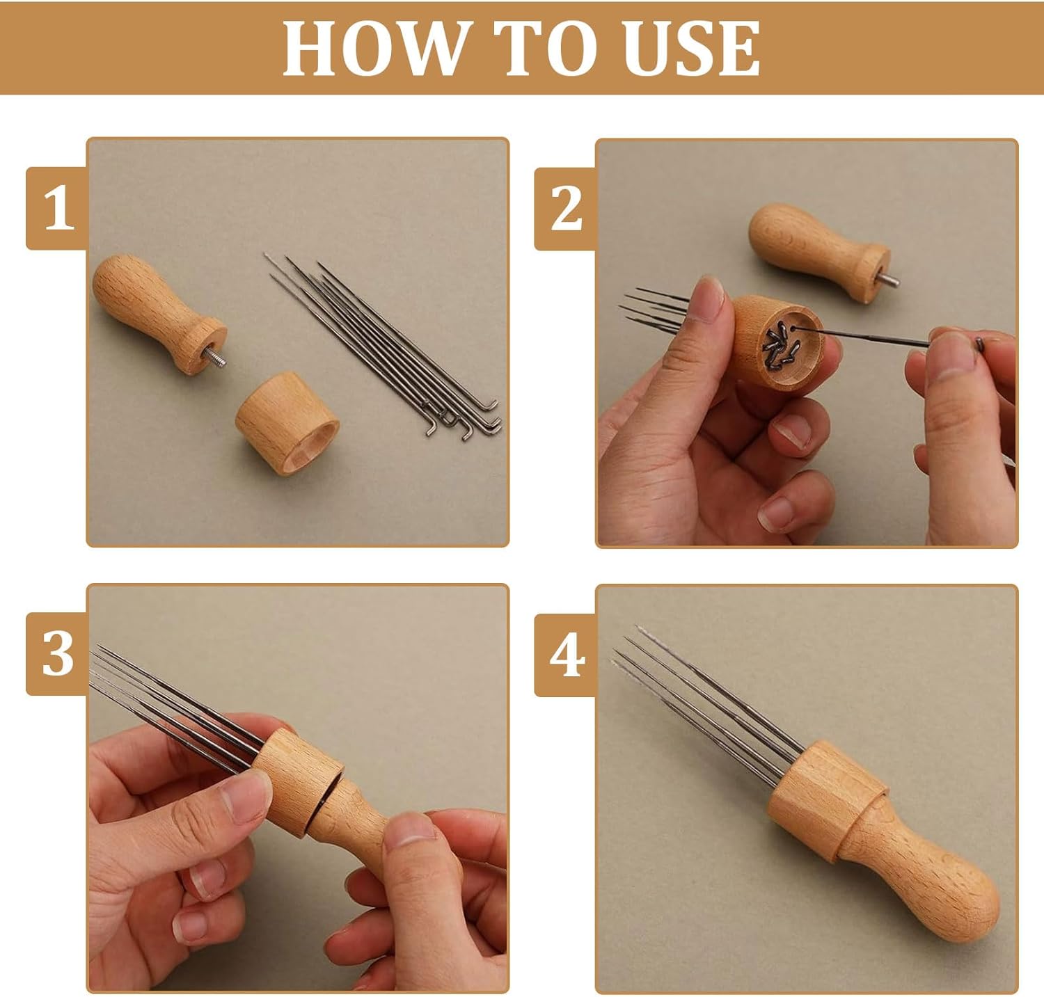De set bevat drie houten handgrepen die prettig in de hand liggen. Eén houder is geschikt voor meerdere naalden tegelijk, ideaal voor sneller werken, en twee houders zijn bedoeld voor precisiewerk met één naald. Het wisselen van naalden is eenvoudig: losdraaien, naald plaatsen, vastdraaien en door.