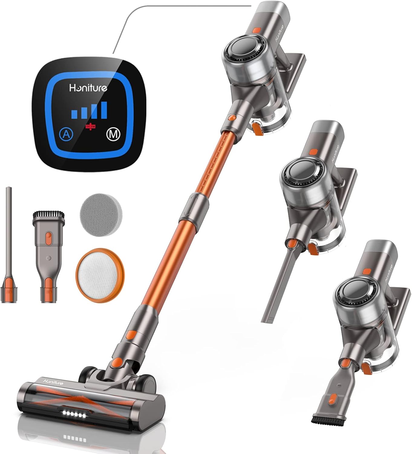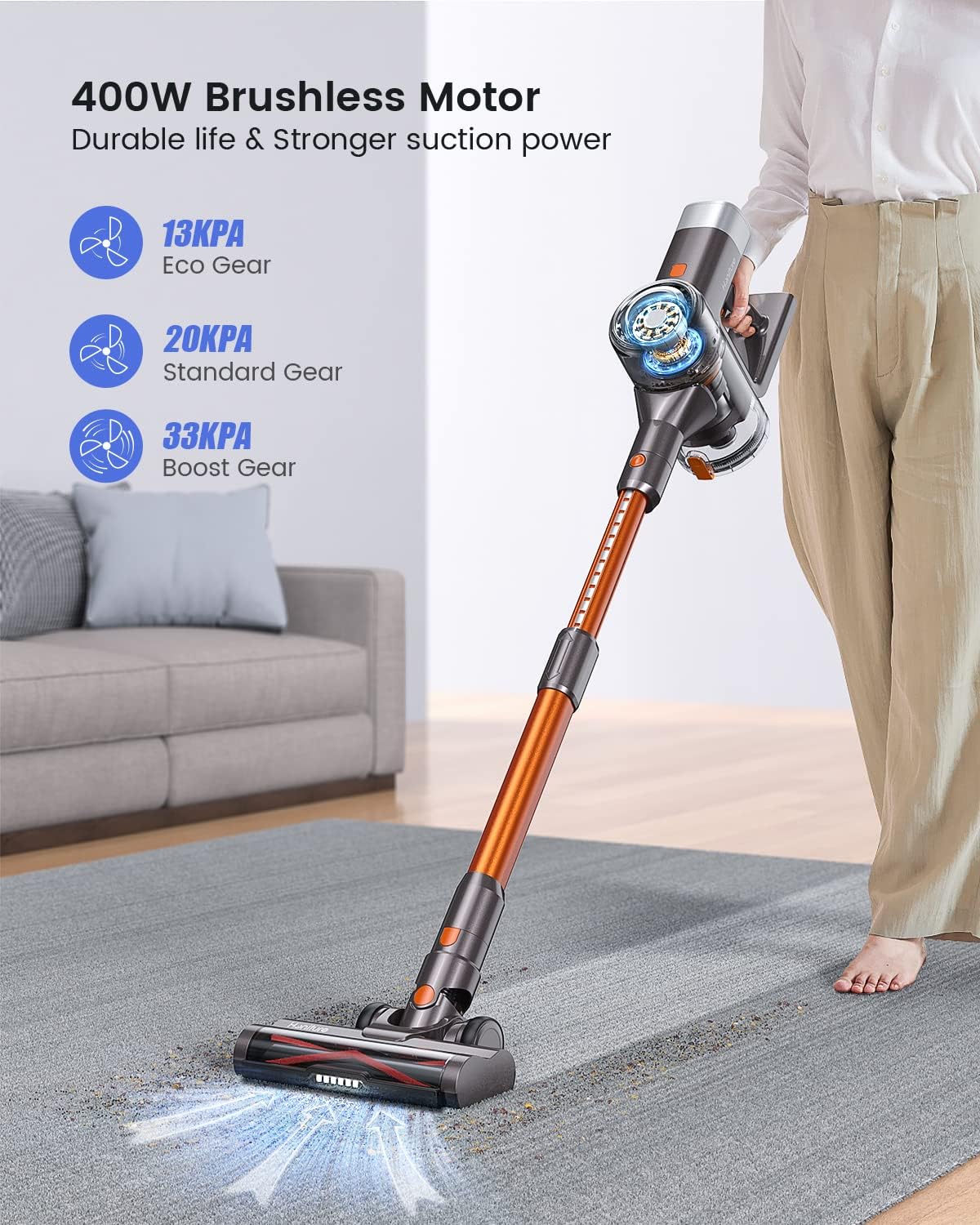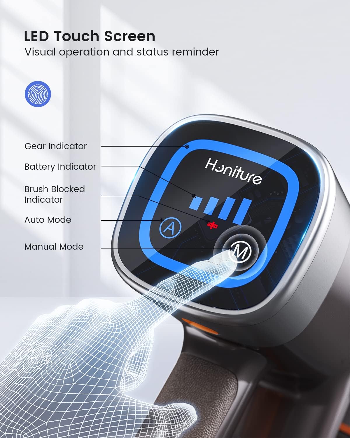Het LCD-touchscreen geeft duidelijk de batterijstatus, zuigkracht en eventuele blokkeringen weer. Naast de automatische instelling heb je ook de handmatige modus waarin je zelf kiest tussen 13KPa, 20KPa of de krachtige 33KPa. De 400W motor en de 7-cell 2500mAh batterij zorgen voor stabiele prestaties: 45 min op lage stand, 30 min op medium en 18 min op maximaal vermogen.