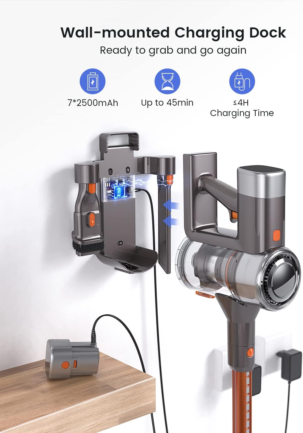 De muurhouder fungeert tegelijk als oplader, zodat de stofzuiger automatisch oplaadt zodra je hem ophangt.